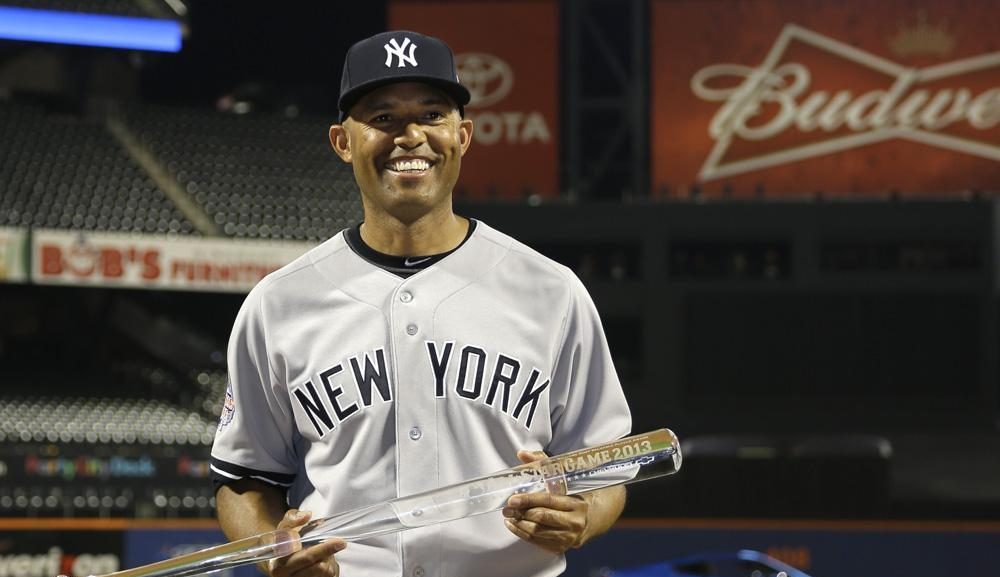 美国职业棒球大联盟(MLB)赢得2013年全明星赛后,纽约洋基队(New York Yankees)的马里亚诺·里维拉(Mariano Rivera)与MVP奖杯合影。