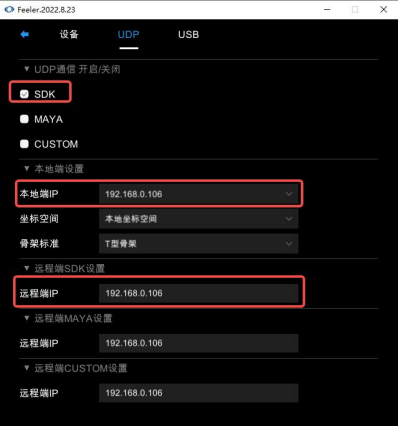 6) Feeler 软件的设置/UDP 页面中,UDP 通信勾选[SDK],设置本机 IP 为当前电脑的 IP,远程 IP 设置为运行 Avatar 软件的电脑 IP,其余保持默认选项;