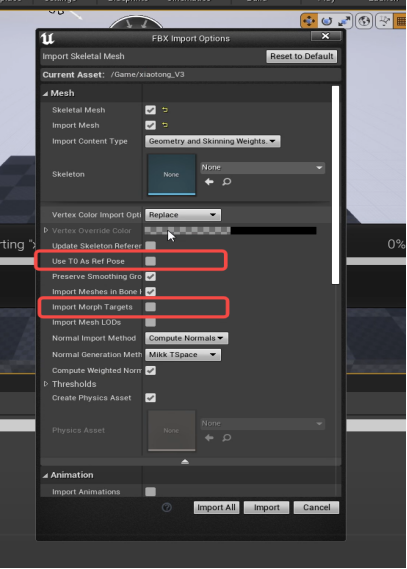 2. 导入模型,拿到模型的时候一般默认会有对应的素材,直接拖入即可,需要注意的是需要勾选:Import Morph Targets (导入变形目标【面补】),Fornt XAxis 强制X轴正方向)两个选项。UseT0 AsRef Poss (第零帧T-Poss )需要根据模型来选择是否勾选。选择完成之后点击Import All (导入全部)。